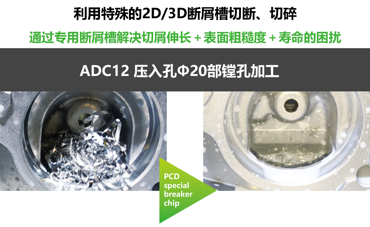 随着汽车相关部件加工向高功能化发展,铝合金材料也得到改进,刀具性能变得愈发重要。PCD切削刀具与硬质合金刀具相比,刀具寿命是其10倍以上,可以得到稳定的精度。
