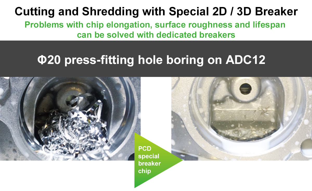 PCD has excellent wear resistance and a small coefficient of friction compared to carbide. Machining accuracy can be maintained for a long period of time by using PCD tips.