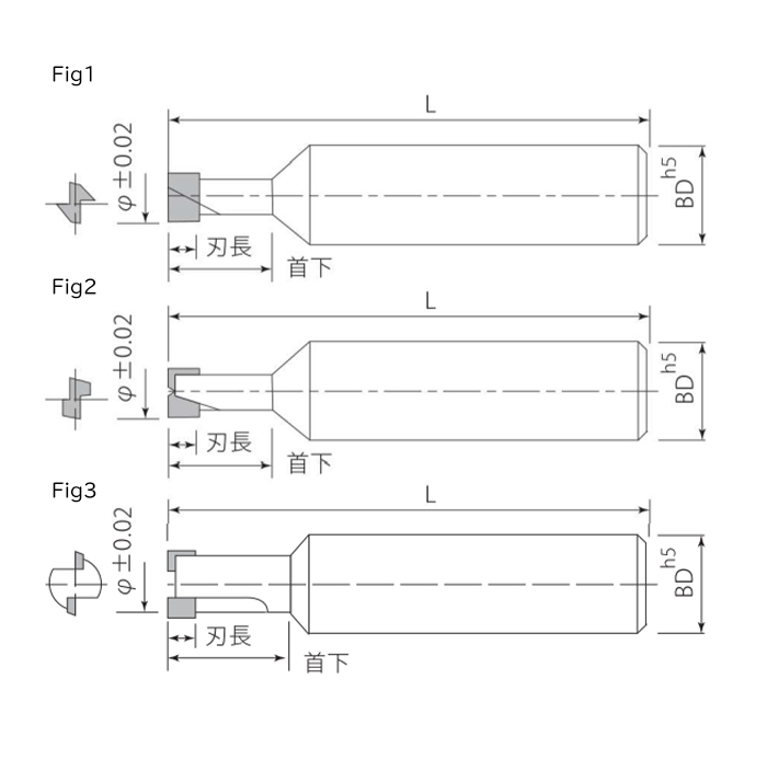 | 品番 | 型式品名 | 刃径 DC | 刃長 APMX | LU 有効長 | シャンク径 DCON | 全長 LF | Fig | 在庫 |