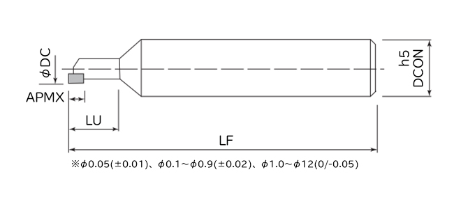 ※目安 1刃あたりの送り量(fz)=0.01~0.05(mm/t)/極小径については0.01以下(mm/t)/送り速度(Vf)=100~500mm/min